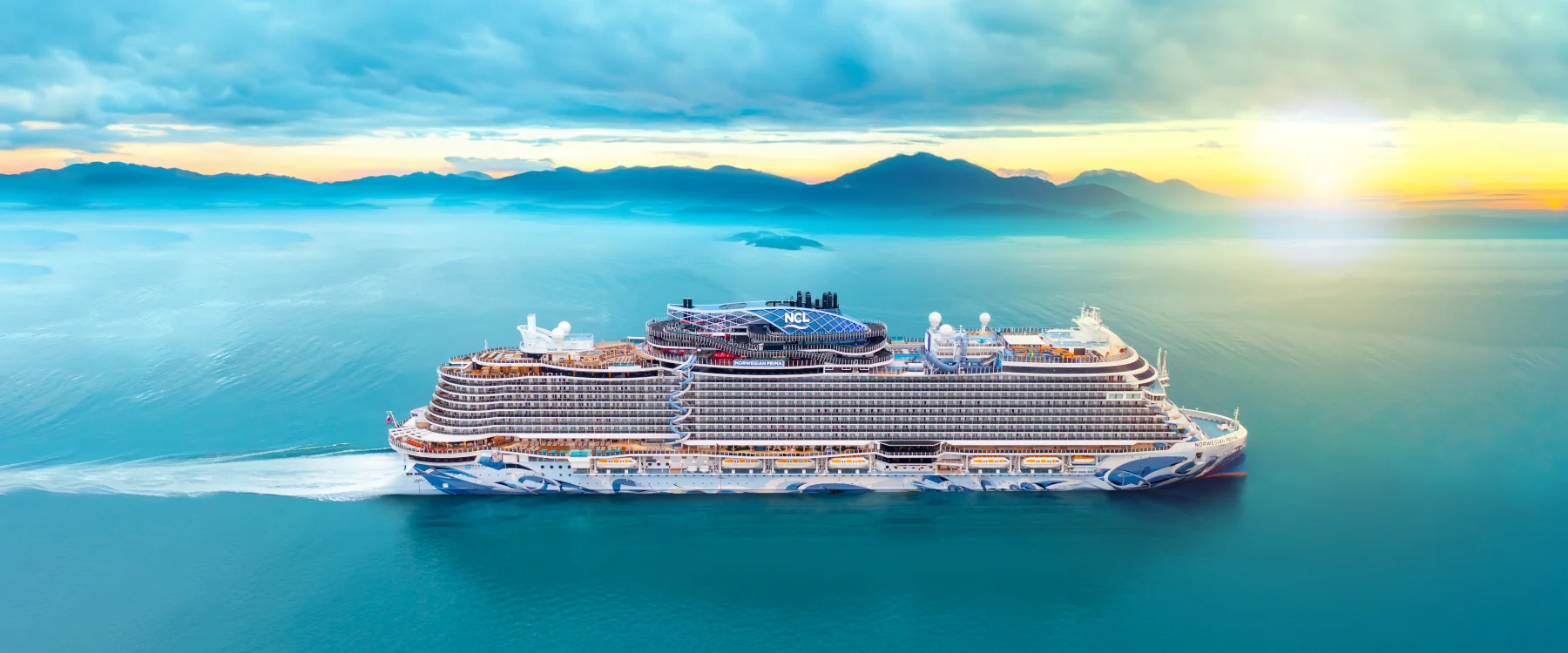 View from deck of cruise ship, sunset